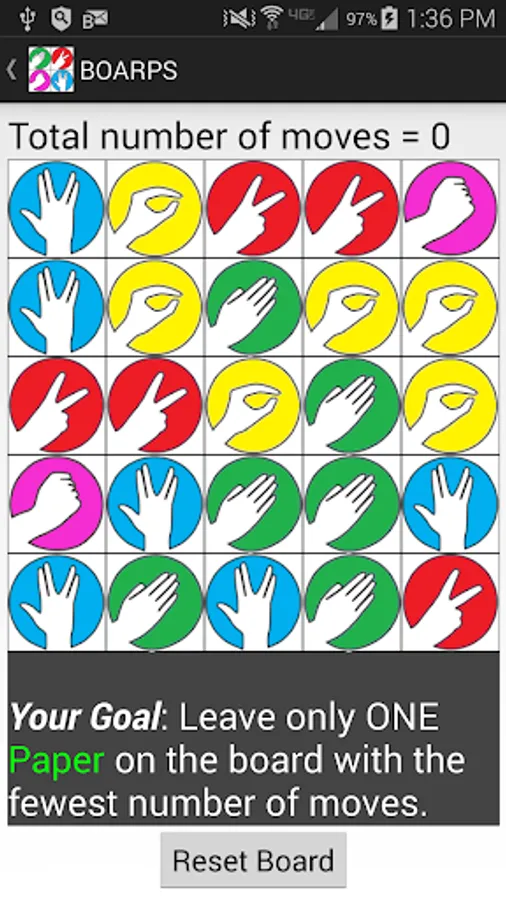 BORPS (Board Rock-Paper-Scissors) is a fun, strategy game. The goal is to leave only one designated hand gesture on the board with the fewest number of moves. Simply touch and drag each hand gesture to move it.