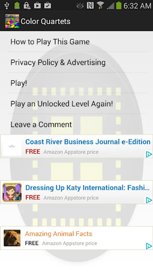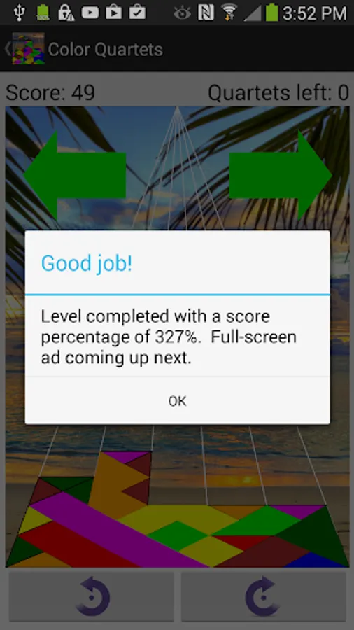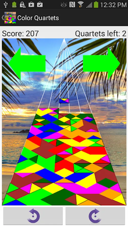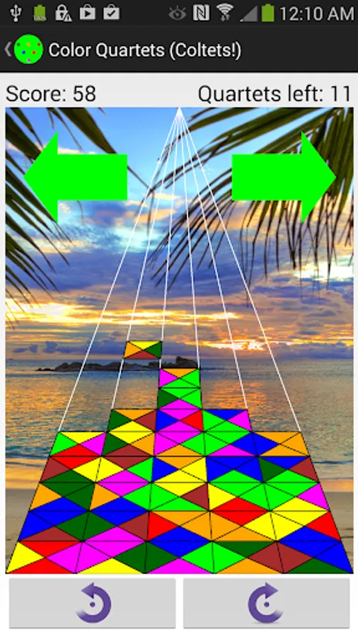 Color Quartets is all about matching the colors! A "quartet" is a block with 4 colors on each side. The goal is to place matching-color sides of the quartets next to each other as much as possible. The larger the matching-color regions, the higher the score! If there's no matching-color side for the incoming quartet, that's an illegal move and you lose the point for that quartet. You'll be scored based on the percentage of the number of matching-color sides plus the number of completed full rows of quartets to the total number of quartets in each level. Just like the IQ, a score of 100% means you're average, 200+% means you're a genius! You can move the incoming quartet to the left or right by simply tapping on the green arrows. You can also rotate the colors in the incoming quartet using the buttons at the bottom.