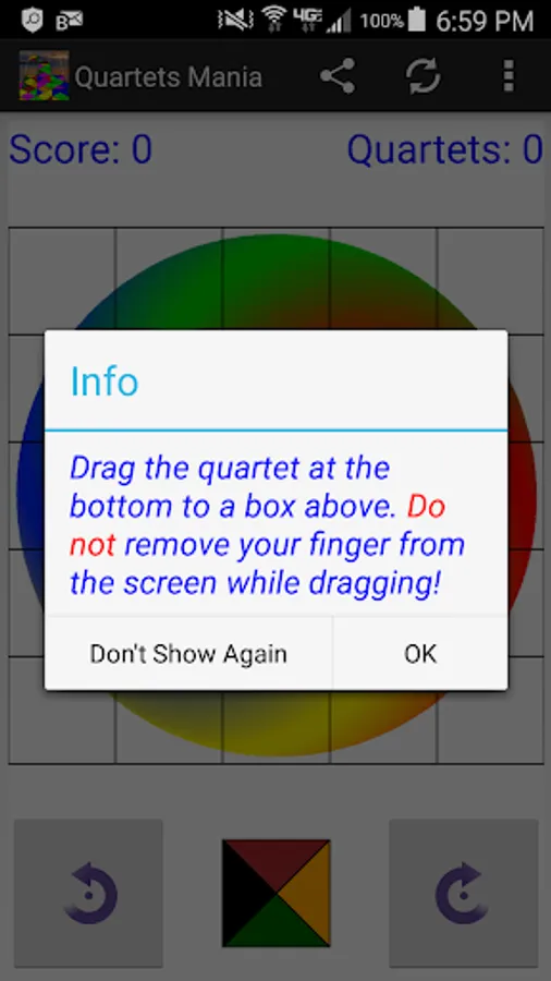 This game is all about matching the colors. A "quartet" is a block with 4 colors on each side. The goal is to place matching-color sides of the quartets next to each other as much as possible. The larger the matching-color regions, the higher the score! If there's no matching-color side for the incoming quartet, that's an illegal move and you lose the point for that quartet. You'll be scored based on the percentage of the number of matching-color sides plus the number of completed full rows and columns of quartets to the total number of quartets attempted. Just like the IQ, a percentage score of 100% means you're average, 200+% means you're a genius! You can rotate the colors in the incoming quartet using the buttons at the bottom of the screen.
