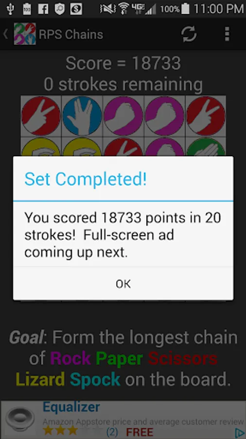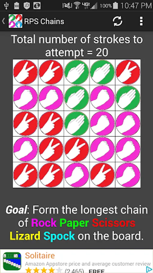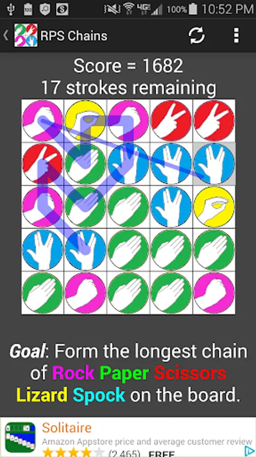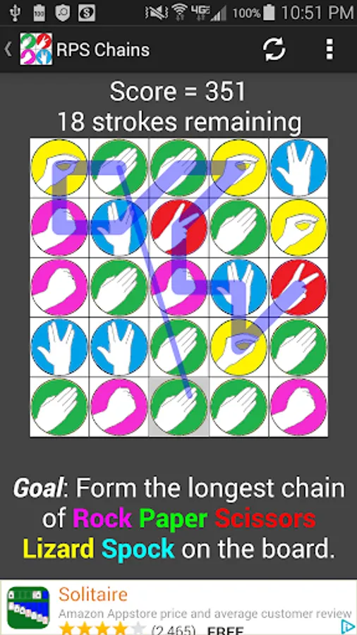 If you like casual games, you'll love RPS Chains! RPS (Rock-Paper-Scissors) Chains is a fun, strategy game. The goal is to create as long as possible chains of hand gestures on the board within 20 strokes. Simply touch and drag each hand gesture to connect it to a compatible neighboring one (Rock > Scissors > Paper > Rock). Your score will exponentially grow with longer chains.