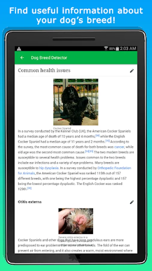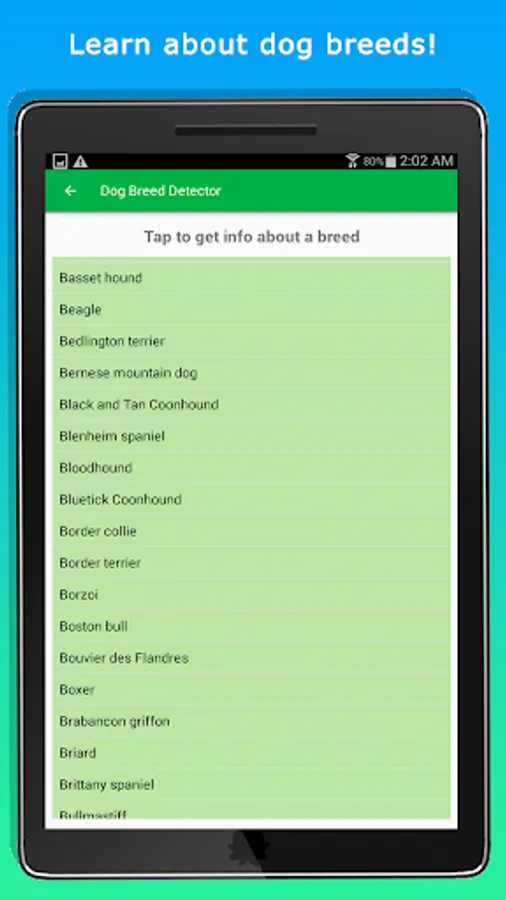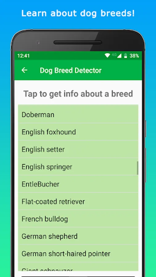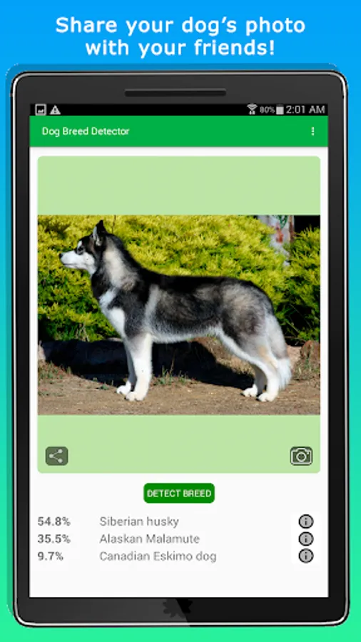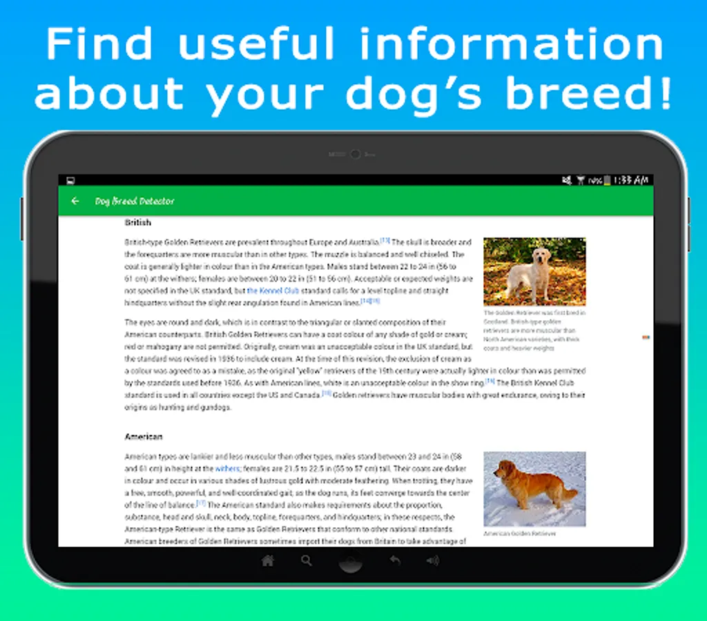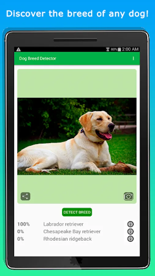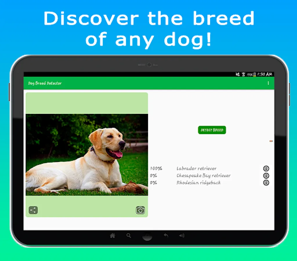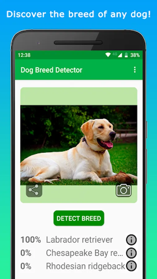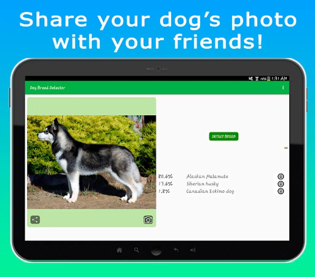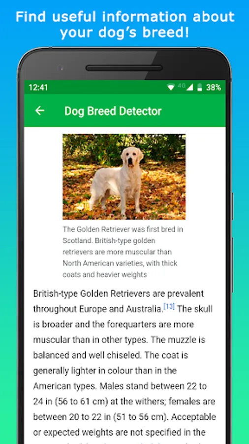 With the “Doggy Scanner - Dog Breed Identification” you can scan any dog to identify its breed. Our scanner analyzes dog features to classify them and detect pure dog breeds. Discover the purebred ancestors of your crossbreed dog. Find useful information about more than a hundred dog breeds within our Doggy Scanner. Identify the breed of your dog and learn about it.