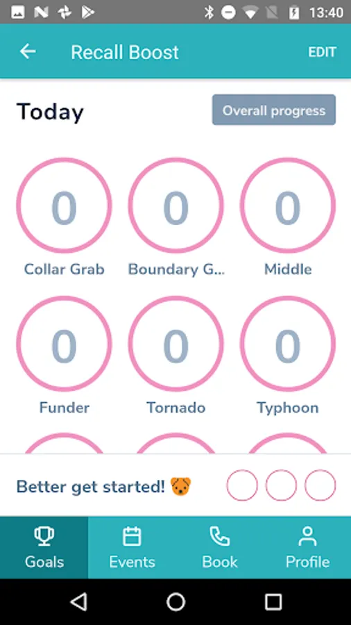 Set up individual goals for all of your dogs and keep track of their progress as they head towards their targets.
