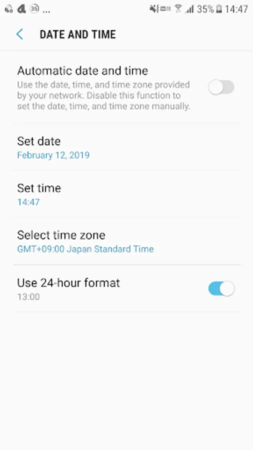 On or Off Automatic date and time(Use the date, time, and time zone provided by your network, Disable this function to set the date, time, and time zone manually.)