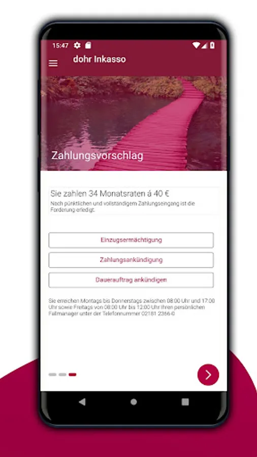 The app is an additional offer to the previous service at dohr. It offers you contemporary communication such as: For example, transferring your personal payment proposal or the daily updated view of your receivables account. Simply photograph your receipts and upload them conveniently in the app. Use the additional contact options via message directly via the app.