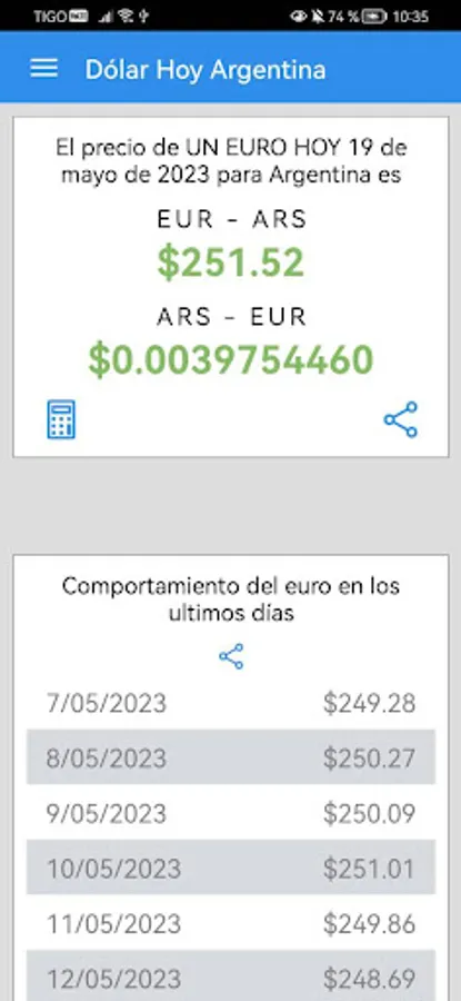 Dollar Today Argentina is an innovative mobile application designed to provide you with accurate and up-to-date information on the price of the dollar and the exchange rate in Argentina. With this application, you will be able to convert between the US dollar (USD) and the Argentine peso (ARS) quickly and easily. In addition, you will enjoy a history of the price of the dollar in recent days and you will obtain valuable information on the euro (EUR). With its intuitive interface and practical tools, Dólar Hoy Argentina becomes your reliable companion to keep abreast of currency market fluctuations.