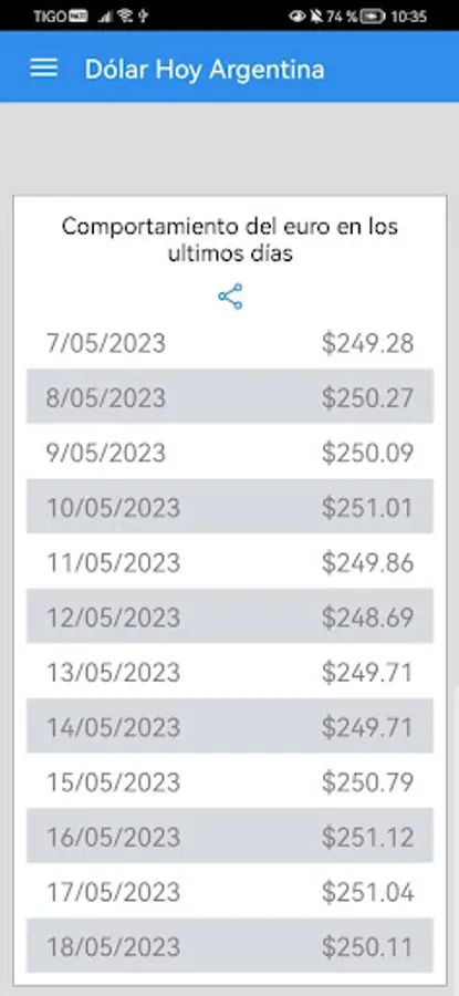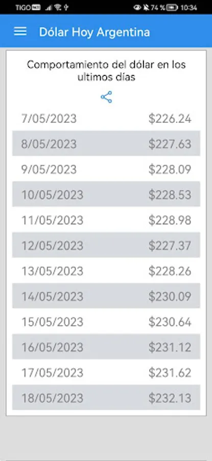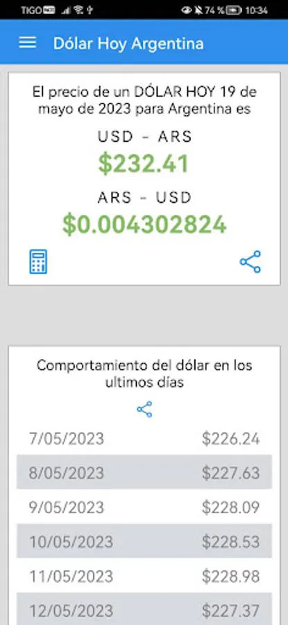 Dollar Today Argentina allows you to share screenshots of the values calculated in the currency calculator. Whether you want to share the results of a specific conversion or show the historical trend of the dollar, you can easily do it through messages, social networks or any other platform of your choice.