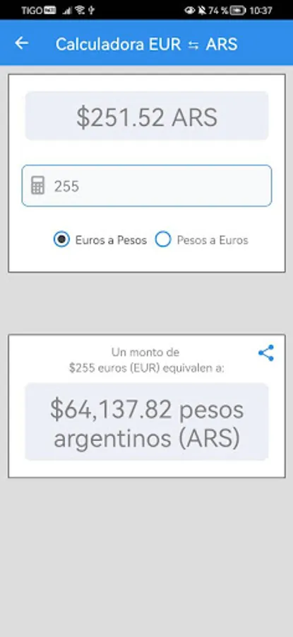 With the app's built-in currency calculator, you can make instant conversions between the US dollar and the Argentine peso, and vice versa. Simply enter the amount in one currency and you'll get the equivalent in the other currency quickly and accurately. This tool is especially useful for travelers, business people, and anyone who needs to transact in different currencies.