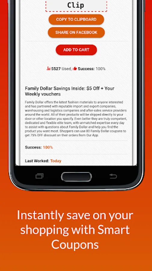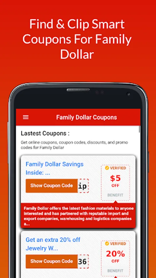 Coupons for family dollar is an independent application which is not related to any other apps or companies. All rights remain their respective owners. This app only gathers all available smart Coupons for family dollar for more convenience of users only.