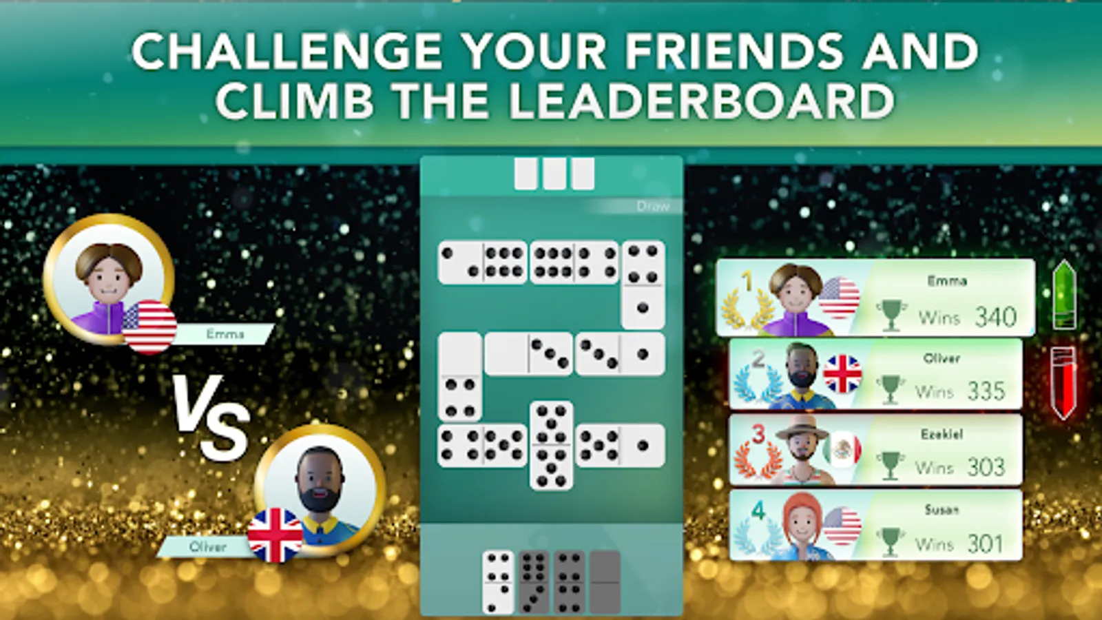 A great selection of board design and domino tiles themes for you to choose from. Customize your avatar and choose a country. Play to win coins and unlock them all.