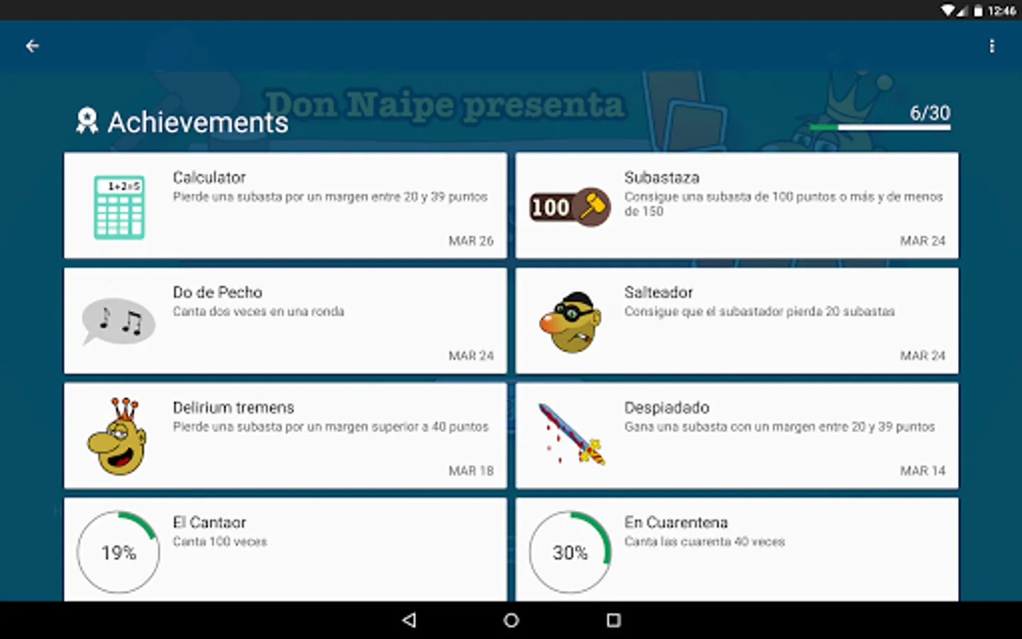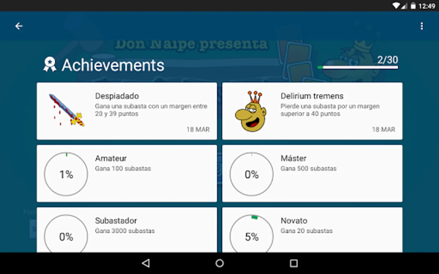 We have included 30 different achievements to squeeze the game, as well as three different markers to compete with friends and all the Tute Subastado players.