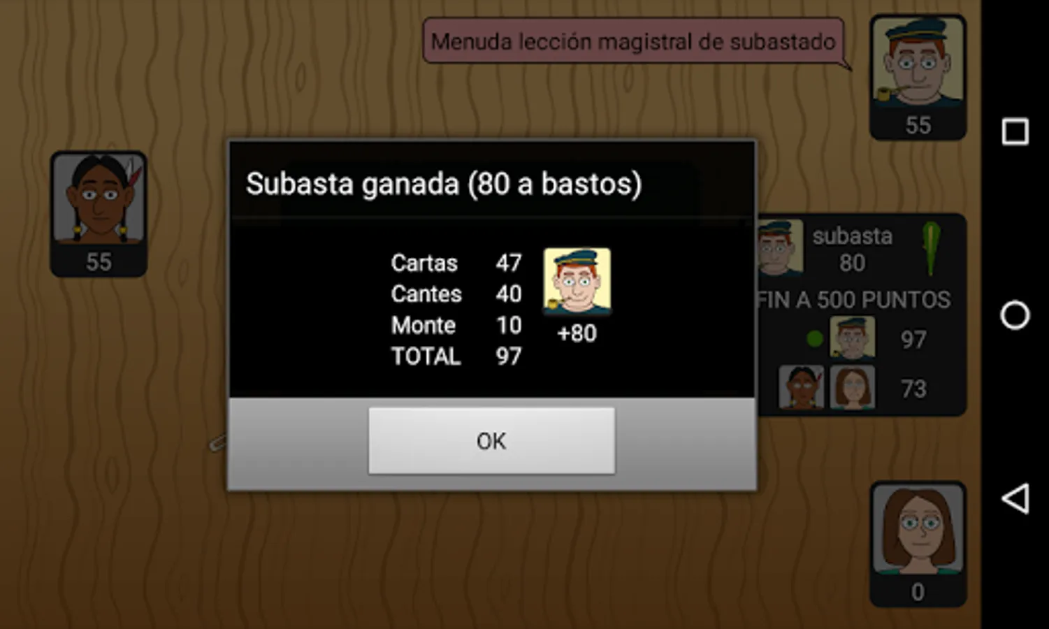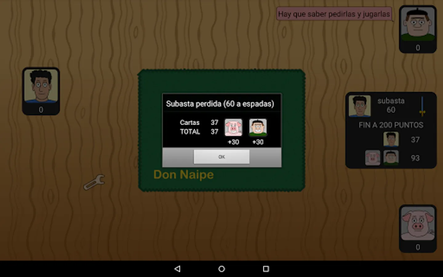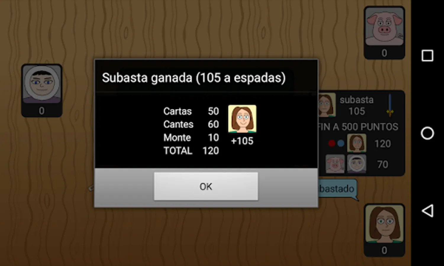 Tute Subastado is only available in individual mode (at the moment). As always, artificial intelligence has been taken care of to the maximum and we can not be more satisfied with the result: at the highest level the bots auction with great criteria and play their cards like the angels (both at auction and against). The bots of intermediate level auction of something more crazy and do not optimize their game. Finally, the lowest level bots represent a minor challenge, auctioning with worse criteria and playing more predictably.