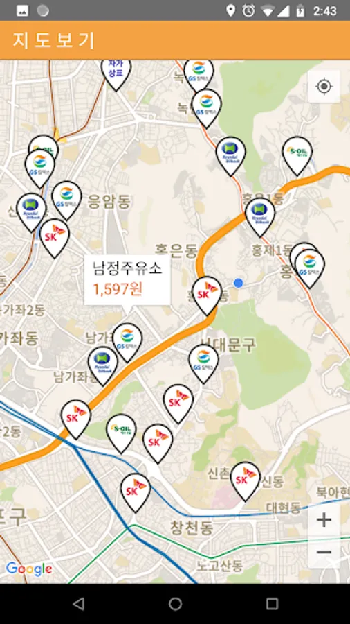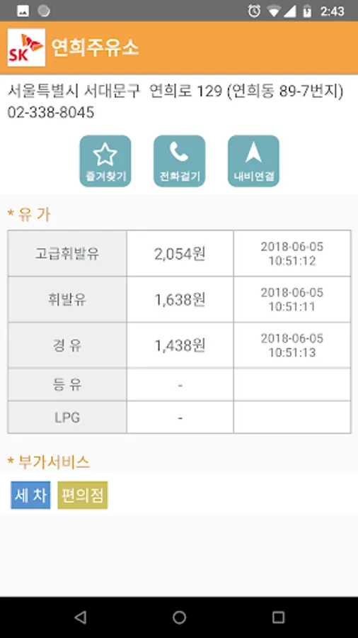 * Shows additional services (light cost, car wash, self-service, convenience store, 24-hour information).
