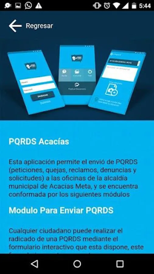 Users can send their complaints or claims requests addressed to the municipal administration by entering the play store and downloading the mobile application called PQRD acacias, after registering where the data is requested: full name, identity card, email, neighborhood, and address. The application loads a module in which the interested party enters his name and password. Followed at the beginning of the session we find a menu in which it allows us to: register the PQRD, consult the (S) PQRD, view a heat map; PQRD registration and access to social networks.