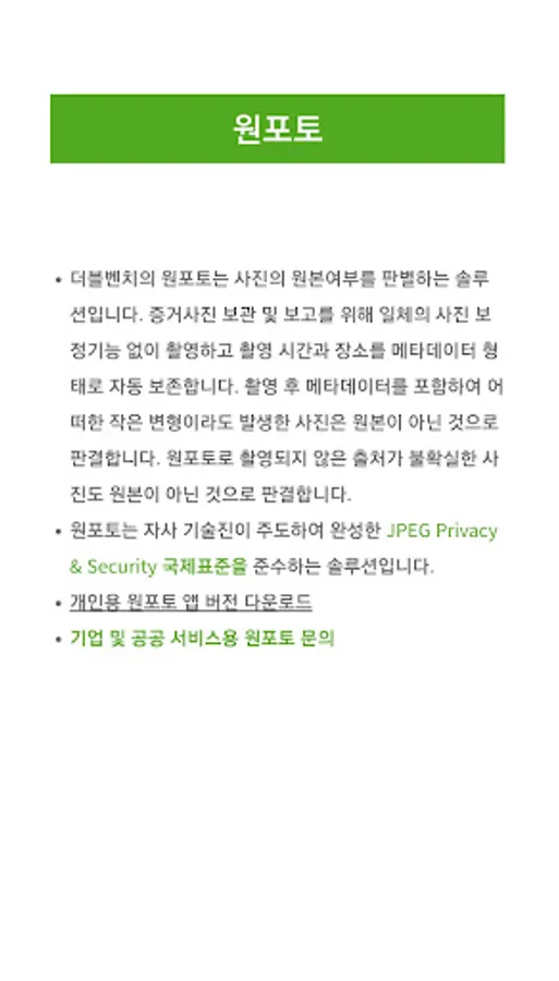 Double Bench's OnePhoto is a solution that determines whether a photo is original or not. For evidence photo storage and reporting, it is taken without any photo correction function, and the time and location of the photo are automatically preserved in the form of metadata. Photos with any minor alterations, including metadata, after taking will be considered non-original. Photos of unknown origin that were not taken with OnePhoto are also judged to be non-original.