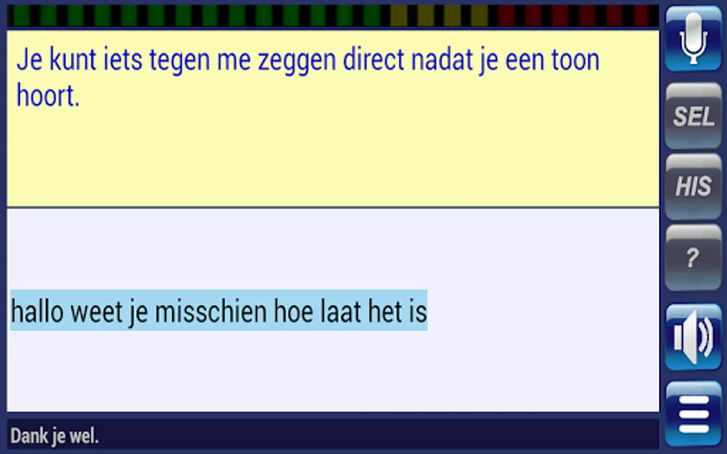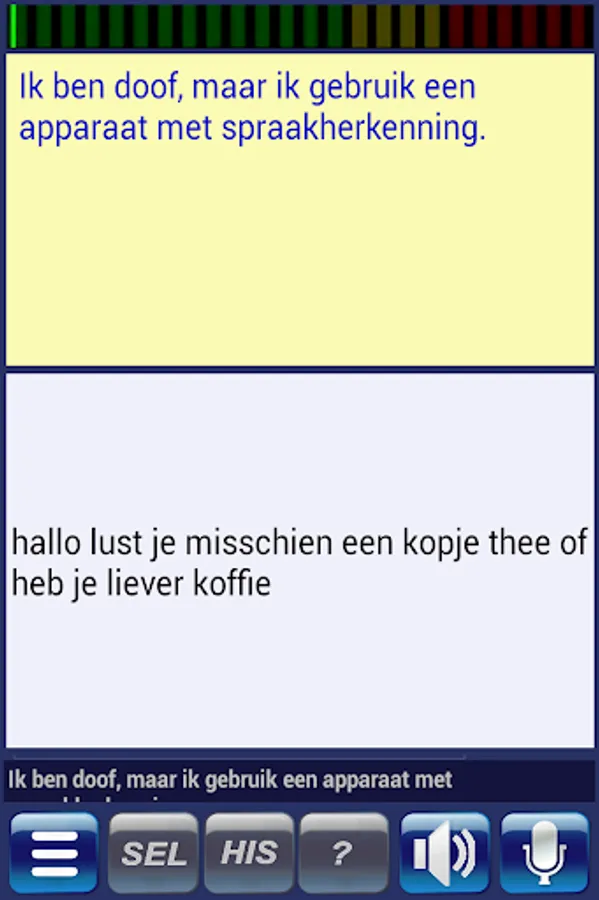 This interpreter app is specifically designed to make communication with deaf-blind persons as easy as possible. It uses speech recognition or simply typing to formulate a short text which can then be passed on to a deaf-blind person by means of vibration in the form of Morse code.