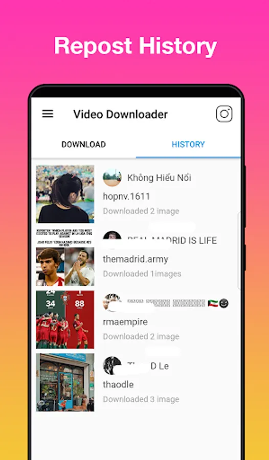 6. History management, save and manange download video and photo that you downloaded from Instagram