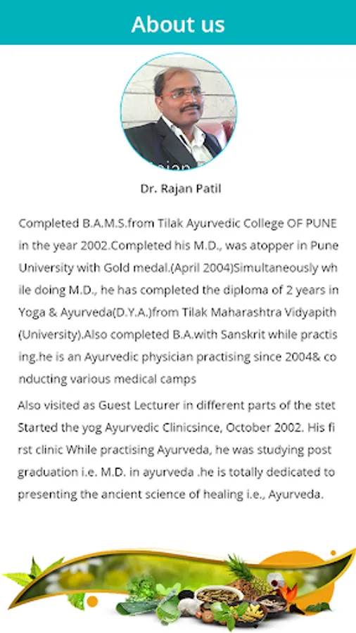 App is based on the belief that health and wellness depend on a delicate balance between the mind, body, and spirit. Dr Rajan Patil is one of those rare and wellknown pulse readers, who can diagnose any type of disease magically.For the benefit of society and expansion of his work in Ayurvedic field. he has started her second Ayurvedic clinic at Nashik .While practising, he has treated so many critical cases with the help of ayurvedic medicines during her registrarship of 3 years.He worked on contraceptives for his thesis during Post Graduation dr rajan patil