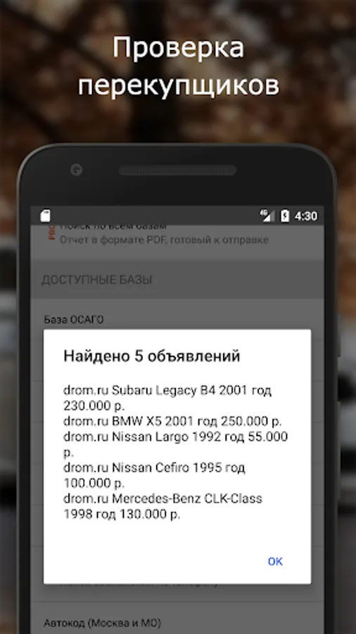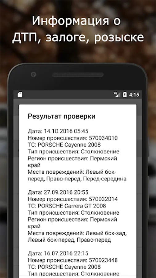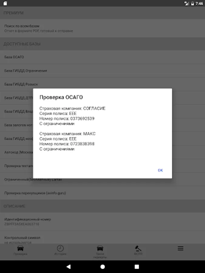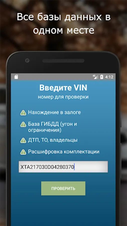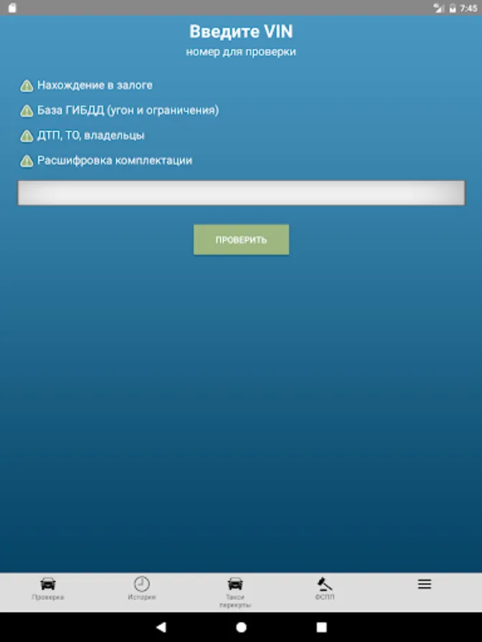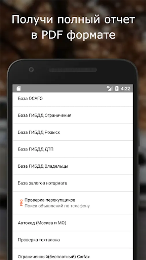 The first and only app that supports all databases for the checks. Accident, traffic police base, deposit banks and bailiffs, TO, information and outbid CarFax reports, theft, checking on the basis of the owner FSSP registry Taxi.