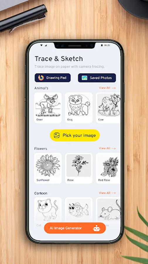 Just select an image from the Trace Drawing app or gallery, apply sketch filter to create image traceable. The image will appear on screen with camera open. Place phone about 1feet above and look into the phone and draw on paper.