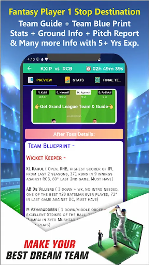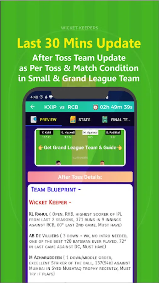 - Match News, Analysis and Teams for Small League and Grand League with Full Stats and Guide