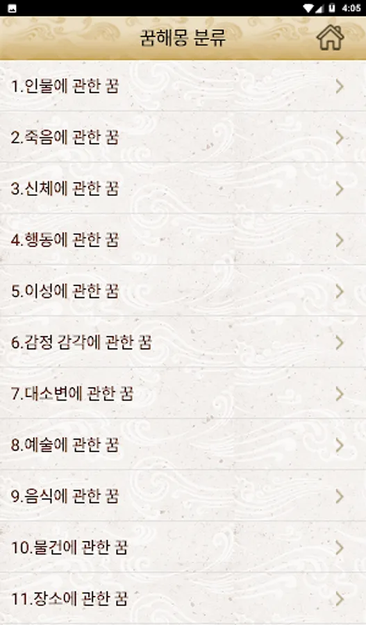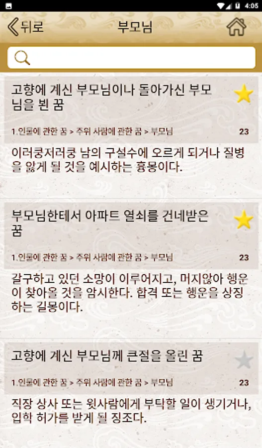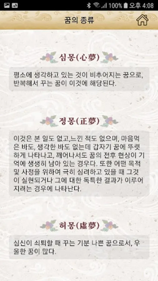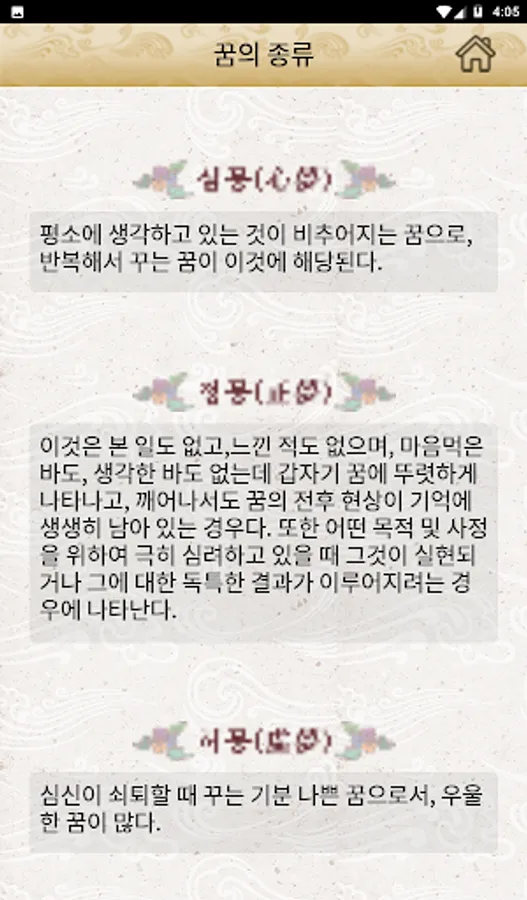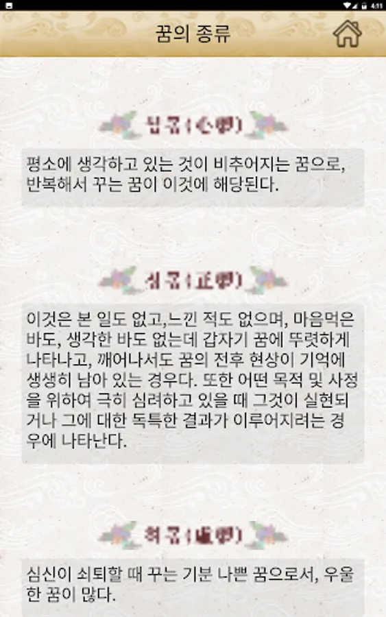 - 꿈해몽 찾기 - 829페이지의 방대한 양의 꿈해몽을 쉽게 찾아줍니다.