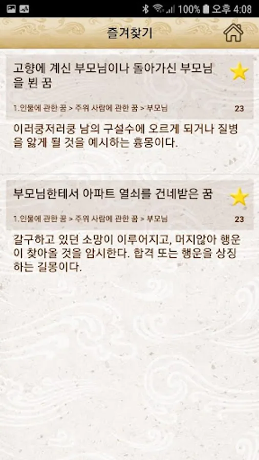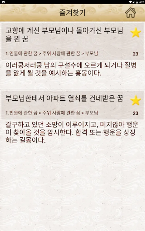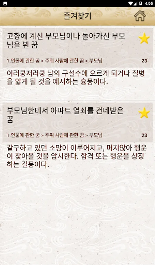 - 즐겨찾기 - 꿈해몽 찾기나, 꿈해몽 분류에서 찾은 꿈을 즐겨찾기로 저장해서 나중에 볼 수 있도록 하였습니다.