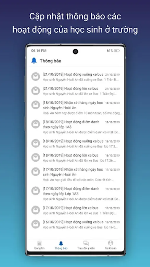 - Nhận thông báo, tin nhắn của nhà trường, giáo viên về việc học tập và hoạt động của con.
