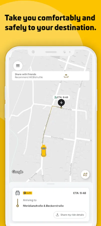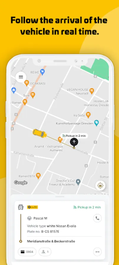 2) Book a ride: Choose your starting point and destination. Your location will be determined automatically, but you can also set addresses manually. Then enter the number of passengers and, if available, your valid public transport ticket. You can book journeys for multiple people - also barrier-free. Then choose your favourite from the suggested journeys and book it at the price shown. The app shows you the way to your boarding point, which you can easily reach by walking.