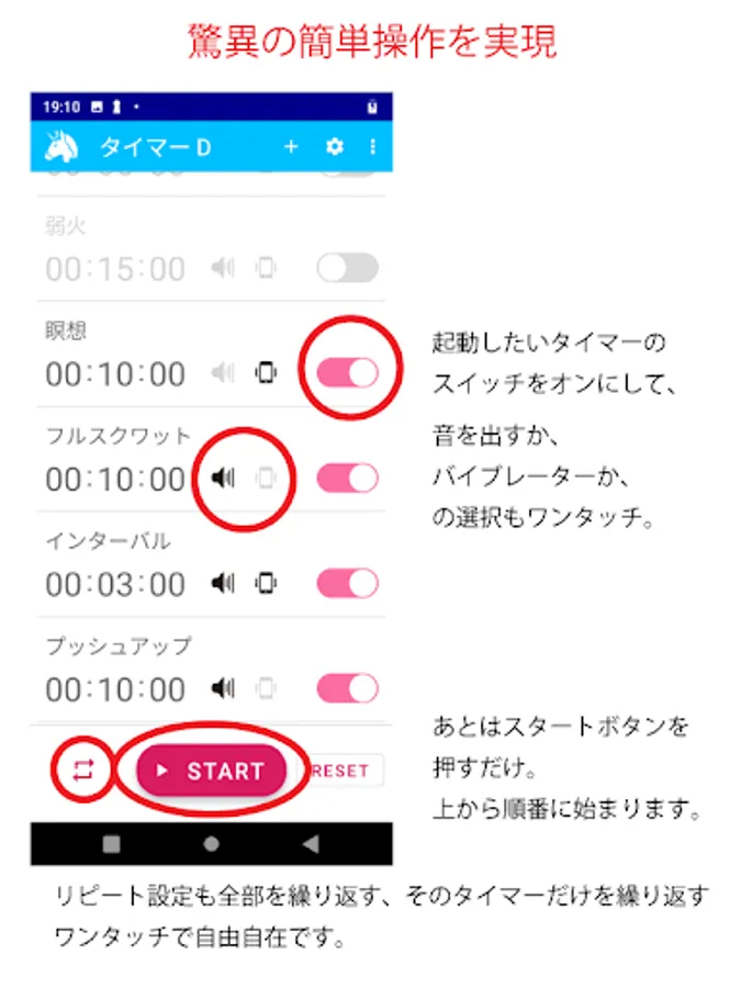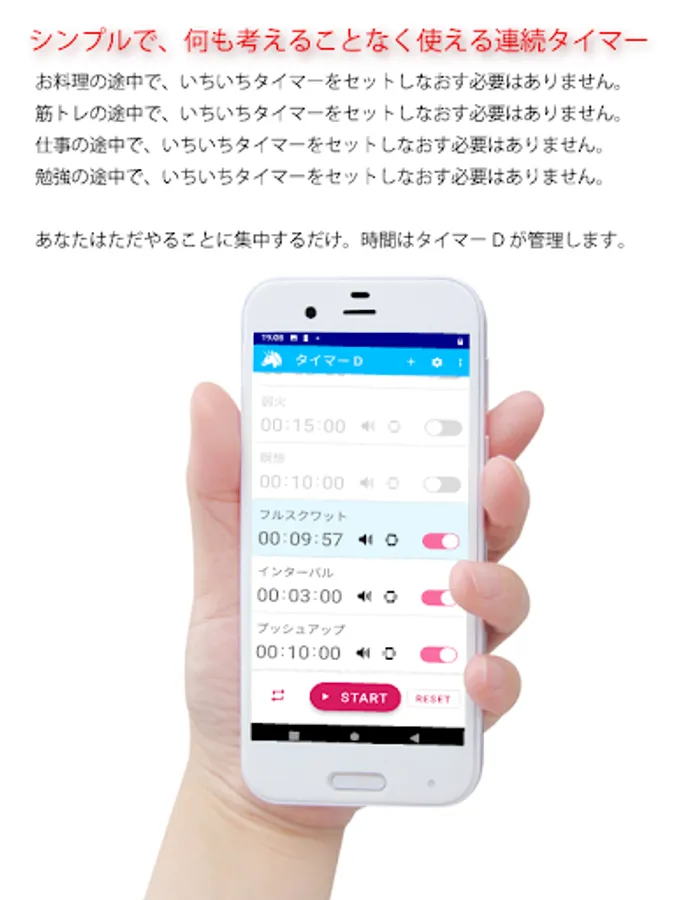 タイマーDは直感的に操作できる時間管理用のタイマーアプリです。使い方は驚くほど簡単です。たくさんのタイマーを登録しておき、必要なタイマーだけをオンにしてスタートを押すだけ。一番上のタイマーが始まり、そのタイマーが終わると次のタイマーが始まります。バイブレーション、サウンドの設定はワンタッチで、タイマー起動中でも可能です。