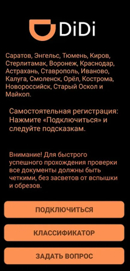 To connect to DeDi taxi, you need to install the "DiDi Driver" application, click on the "CONNECT" button, enter the required data and upload the documents.