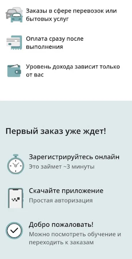 We provide an opportunity for everyone to earn money on their car or motorcycle in the taxi industry or to compensate for the cost of a vehicle. You choose your own working hours - you can work full time or earn extra money according to a free schedule. There are many free orders available in the application, and you can also set up filters, select areas of work and preferred order amounts.