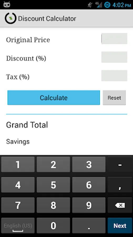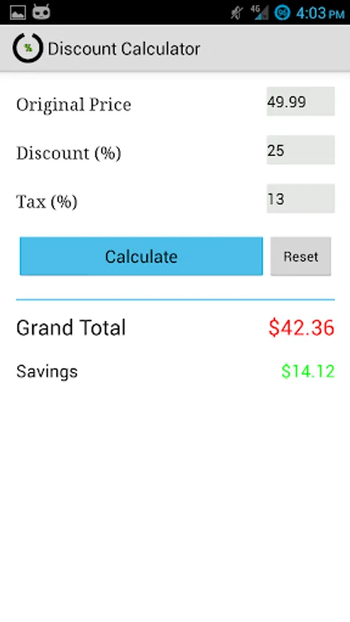 The cleanest, simplest, and easiest discount calculator available on the play store. Simply enter the retail price, the discount offered, and your local tax amount (if applicable) and hit "Calculate". It's as easy as that, and you will find out in seconds how much money you saved.