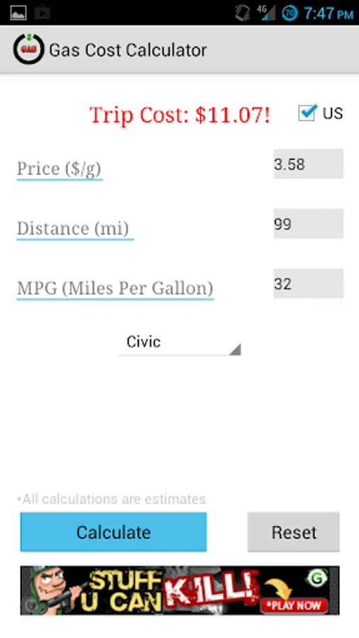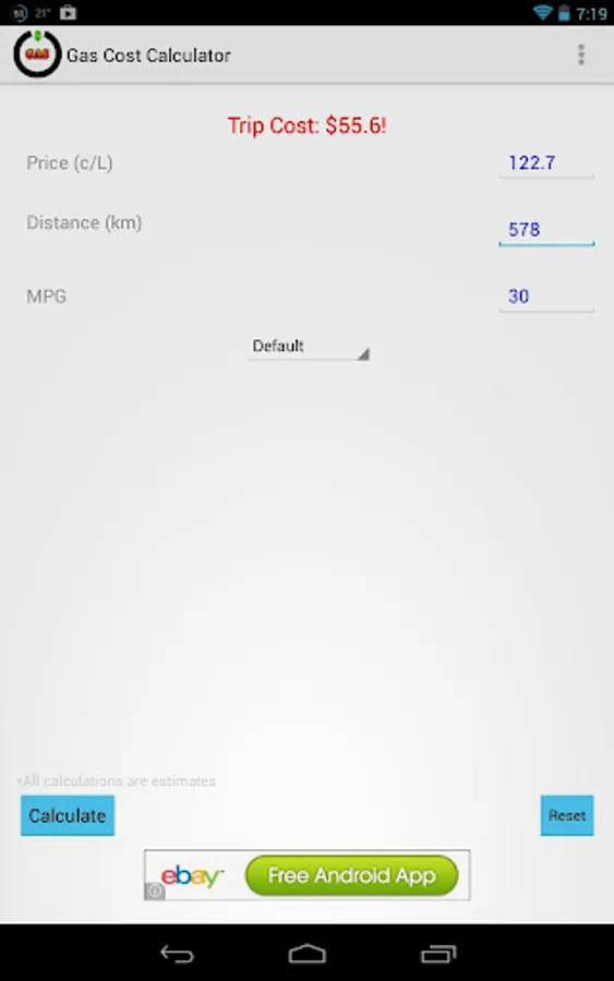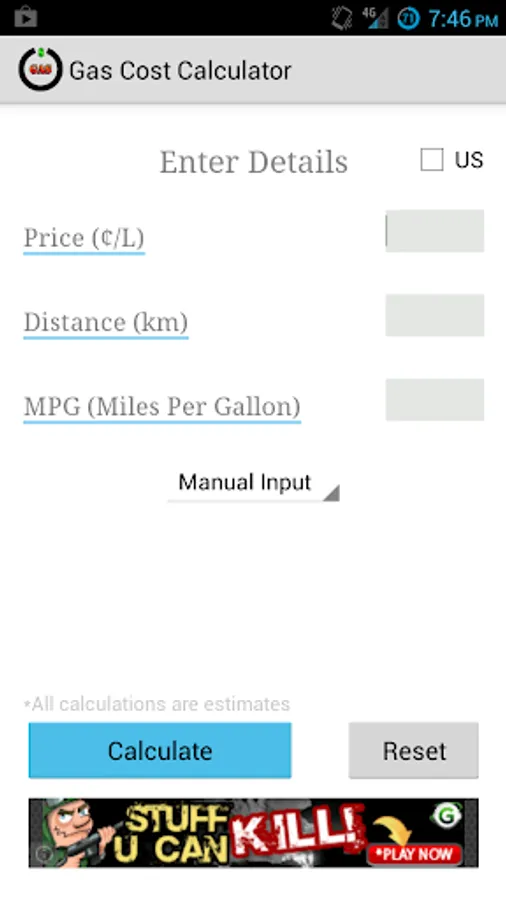 There are built-in values set for MPG for a handful of cars. If you notice that your car is not listed in the application, it is very simple to manually input your own MPG, which gives you better accuracy in gas cost calculation! To do this, simply select the 'manual' option (which is enabled by default) to calculate your gas cost for an entire trip.