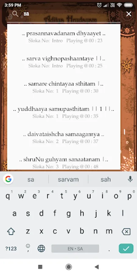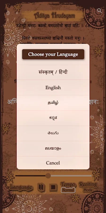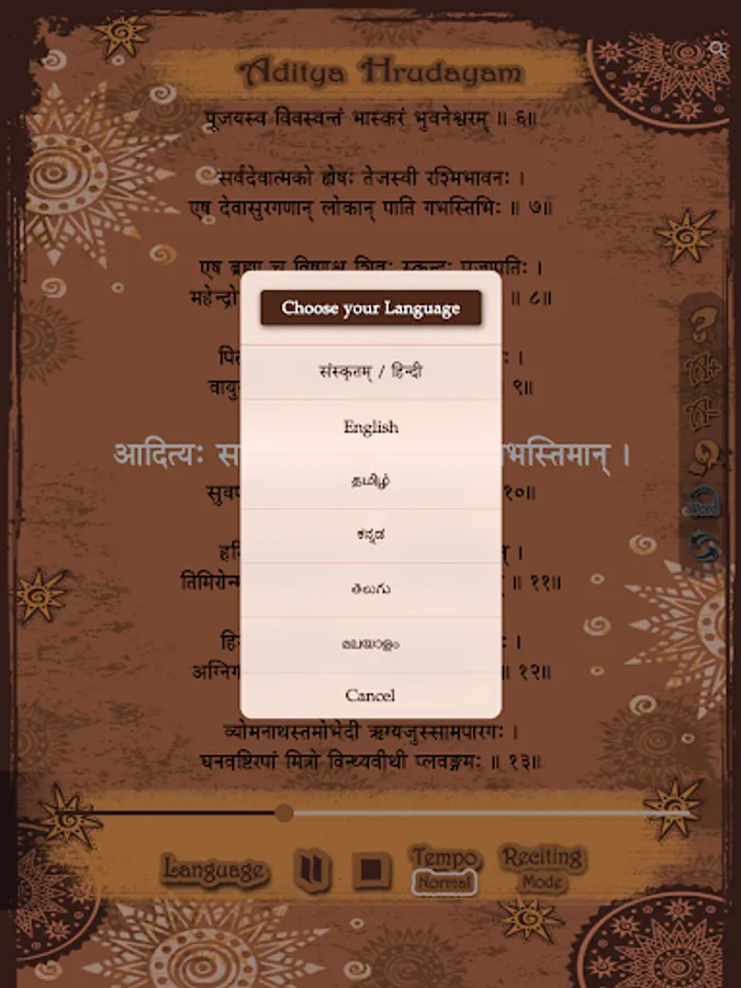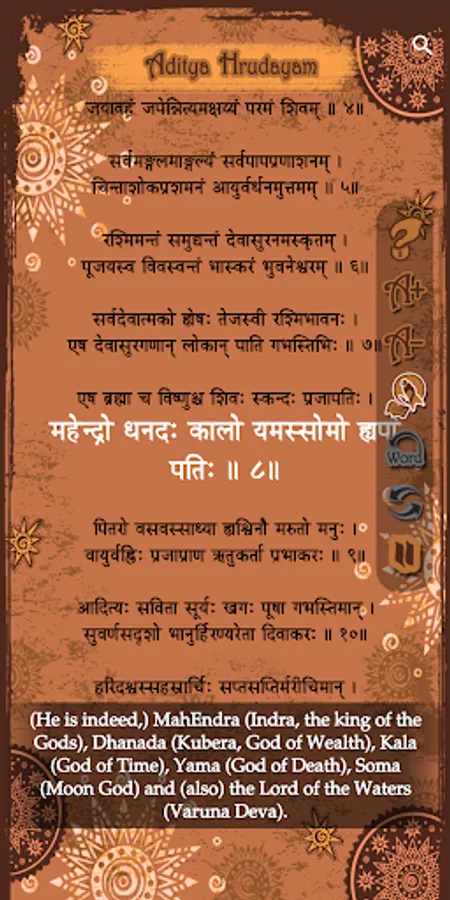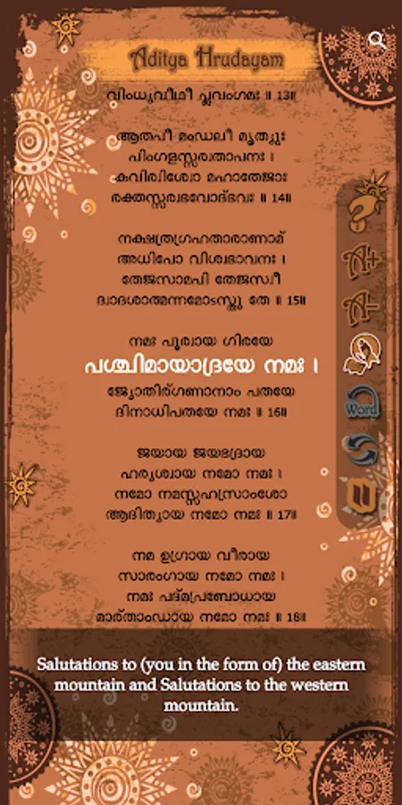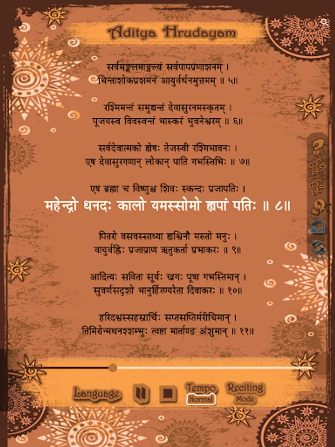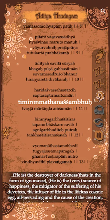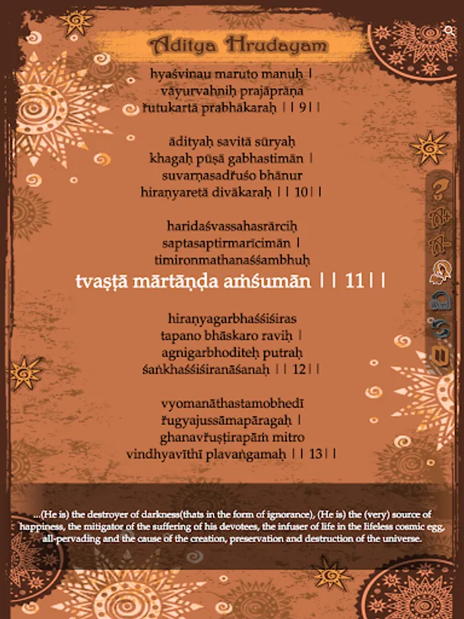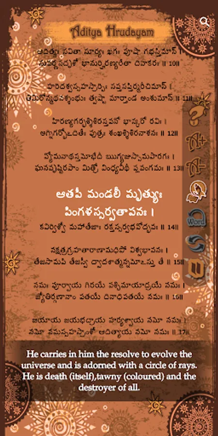 2. Multi language support for Aditya hrudayam stotram in Telugu, Hindi, Sanskrit, English, Tamil, Kannada, Malayalam and more to be included (or) famously referred in the search as 'with Lyrics' in 5 languages is also included.