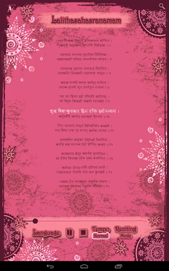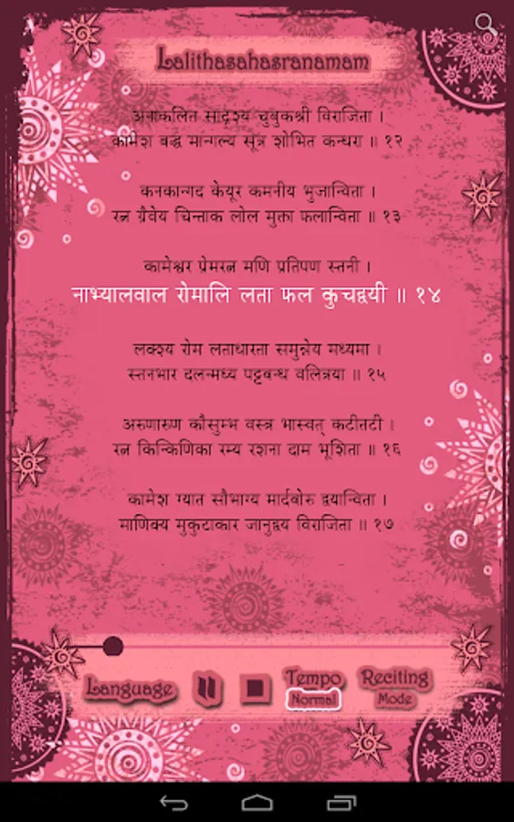 This is a text from Brahmanda Purana. It is a sacred text to the Hindu worshippers of the Goddess Lalitha Devi, i.e. the Divine Mother or Goddess Durga, in the form, Shakti. She is the Goddess of bliss, an epithet for Shiva's wife Goddess Parvati. This hymn contains a thousand names of the Hindu mother goddess Lalita. The names are organized in a hymns (stotras). It is the only sahasranama that does not repeat a single name.