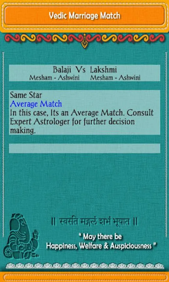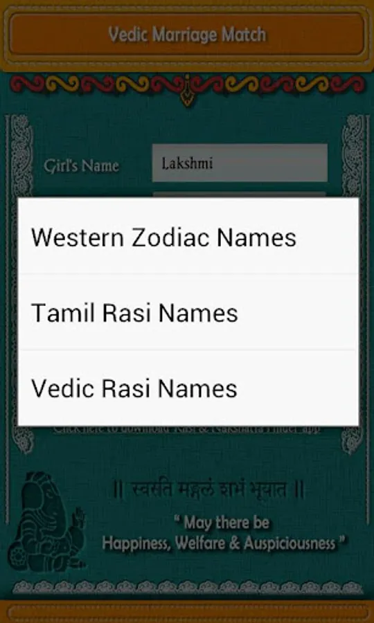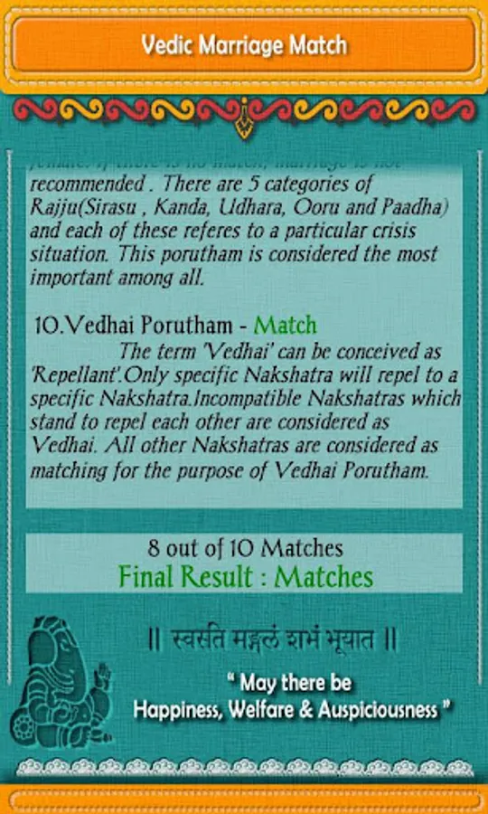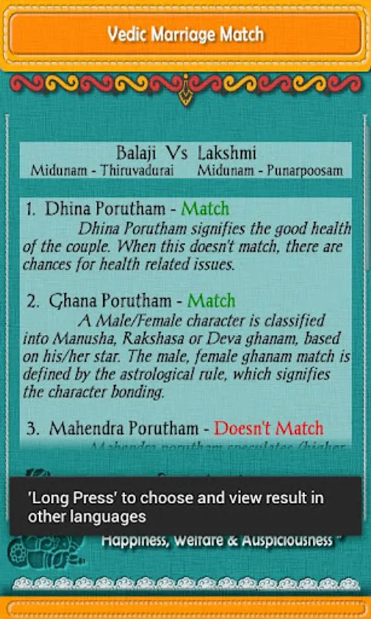 P.S: The result of any of the combinations would either be ‘Match’, ‘Average Match’ or ‘Doesn’t Match’. As far as this app is concerned, for a better user friendliness & clarity, the result of a particular Porutham would either be ‘Match’ or ‘Doesn’t Match’. The result ‘Average Match’ is considered for the final result (after considering all the 10 Poruthams).