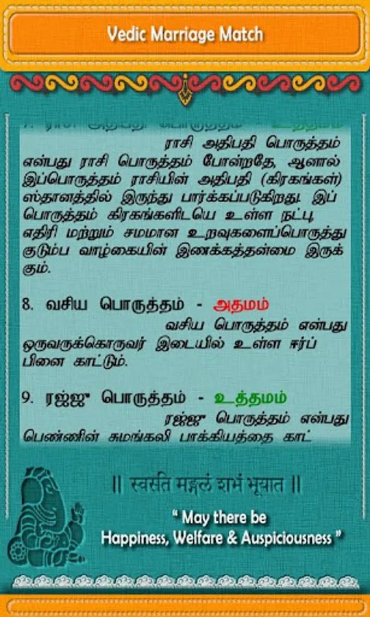 Jathaka porutham (Horoscope match) is designed as an application called 'Vedic Marriage Match' that would prove useful to anybody who wants to choose the right life partner & would involve an astrological process to match the horoscopes of the prospective bride & groom. Usually, this is performed by an astrologer who analyzes the 2 horoscopes (kundali matching). The main objective being, is to ensure a harmonious, balanced & a healthy married life with long & prosperous marital relationship.