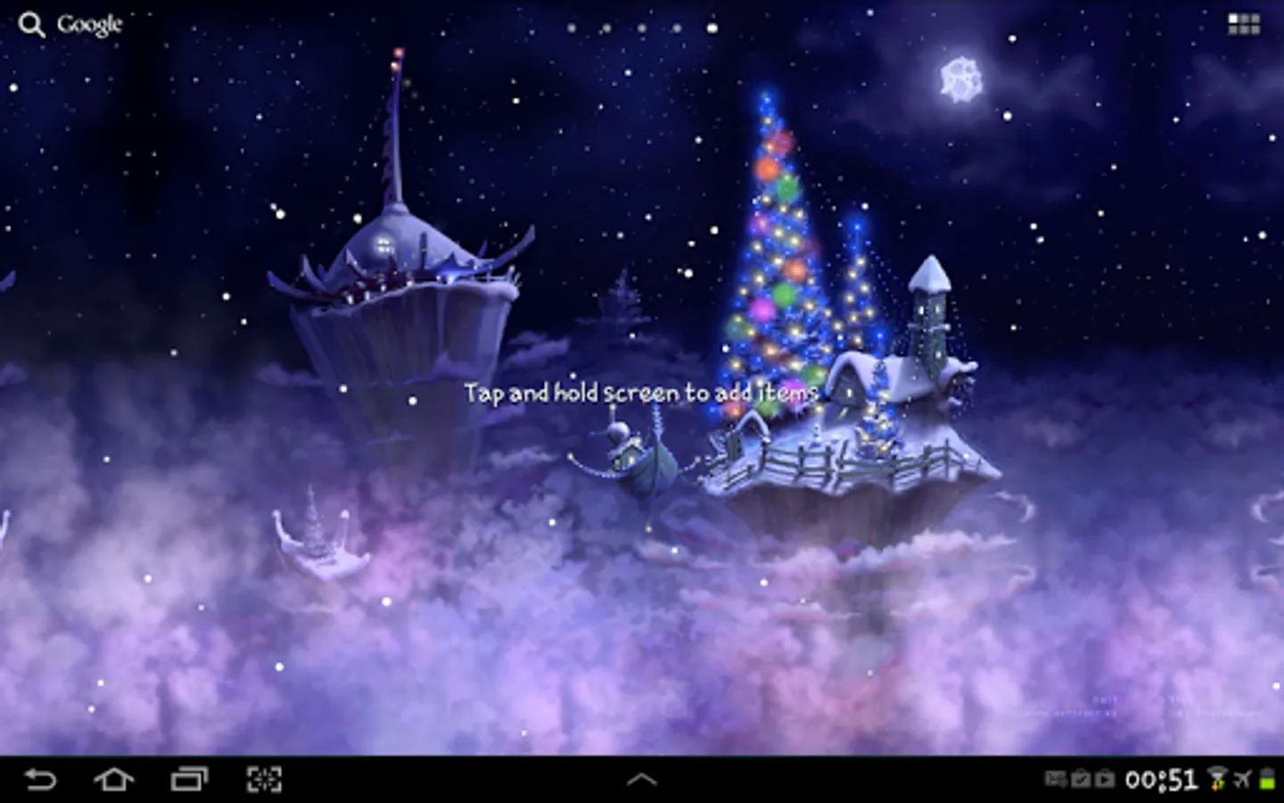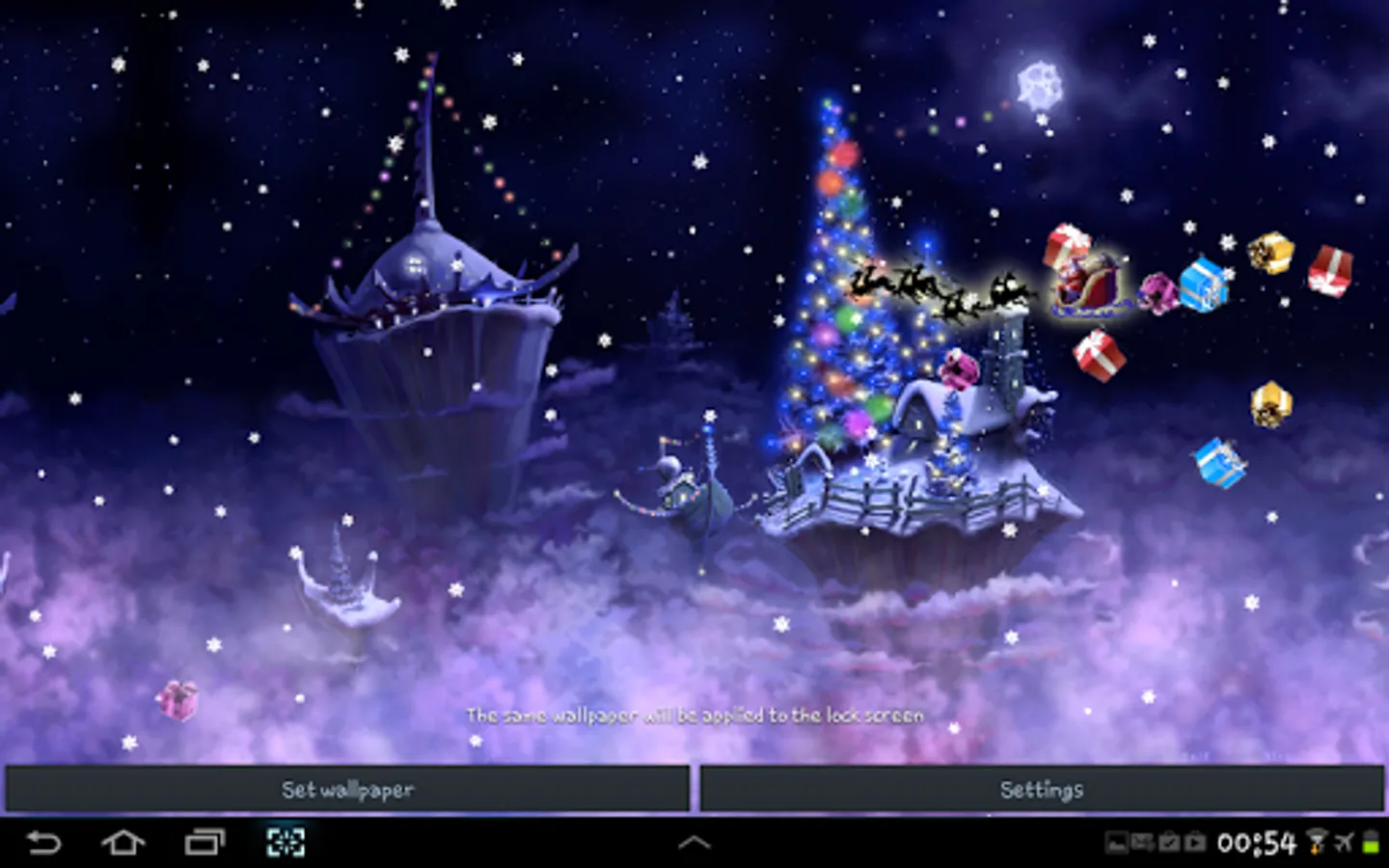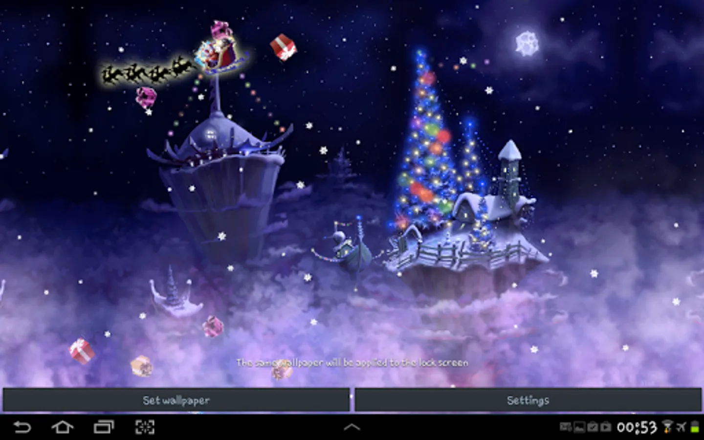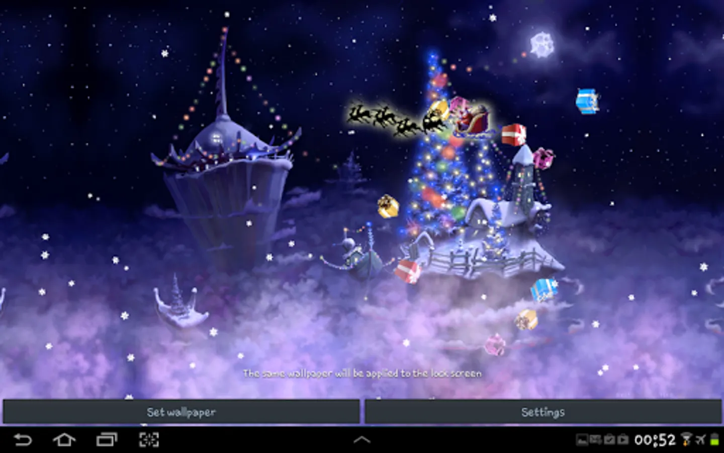 Christmas Snow Fantasy is a live wallpaper. This is a fantasy tale which gives the christmas spirit high in the snow sky between the stars and the moon. With little lovely house, big christmas tree, christmas lights and Santa Claus who gives a lot of presents when he is shaken. The fantasy christmas tale has two christmas carols and many customisable options. That makes this wallpaper your own Christmas fantasy. Choose the snow shape and how much snow you wish, put wind as you wish , change the christmas lights, play with the stars and more.