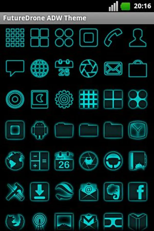 · Choose other Wallpaper, select Menu->Wallpaper->FutureDrone Walls, Choose and set as wallpaper. · To use the Dock Pack (for ADW EX users), press Menu->More->ADWSettings->Themes Preferences, (scroll down) select Main Dock->Choose...->Custom...->FutureDrone ADW Theme->Choose Dock.