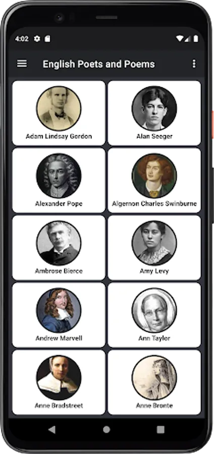 English Poets and Poems App is the Best App for Poetry Lovers. we have chosen very Popular poets for showcasing their poems in our App, as a result, you can read all famous poems from inside the app. you won't need to find them individually.