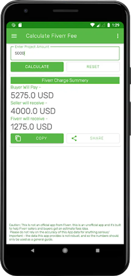 Caution: This Is not an official app from Fiverr. this is an unofficial app and it's built to help Fiverr sellers and buyers get an estimate fees idea. Please do not rely on the accuracy of this App data for anything serious/important - the data this app provides is not robust, and so the numbers should only be used as a general guide.