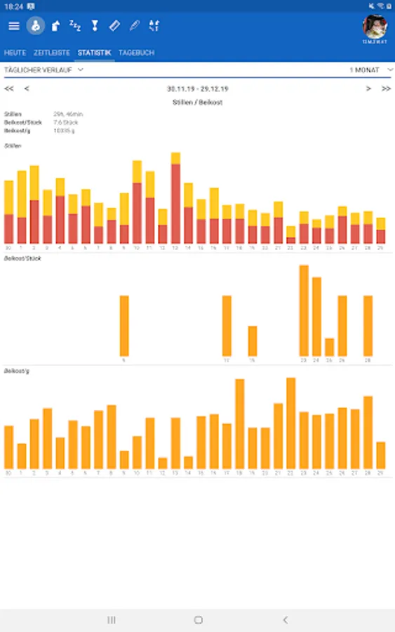 - Graphical analysis of the logged daily breastfeeding times and meals.
