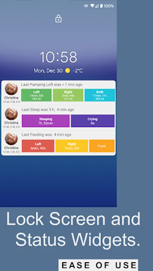 - Widgets including start, pause and stop buttons (two sizes, small and big). Therefore no need to even open the app to log a baby nursing!
