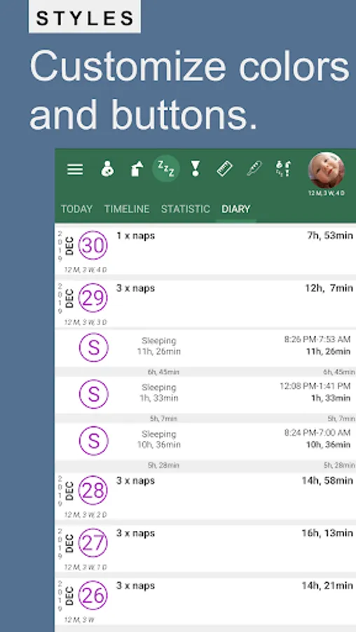 - The analytic graphs and diary keep a log of naps and wails just like for any other baby nursing event.