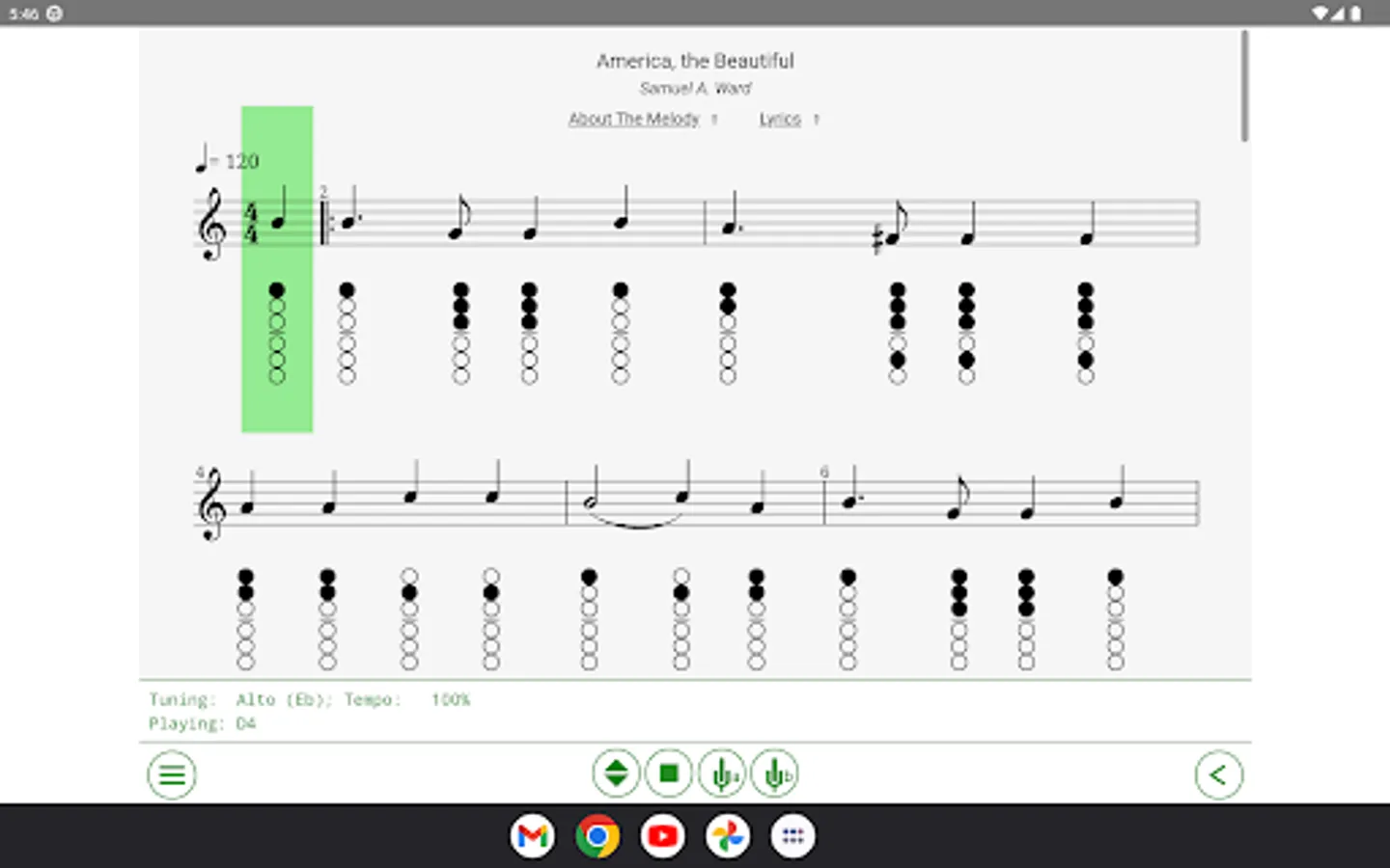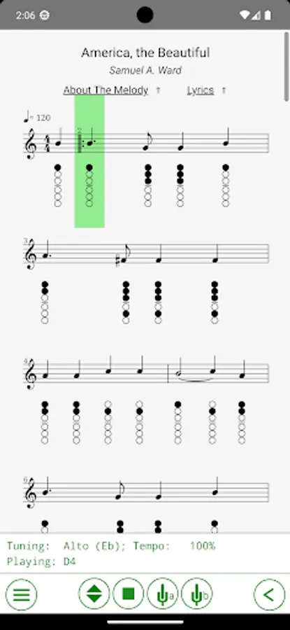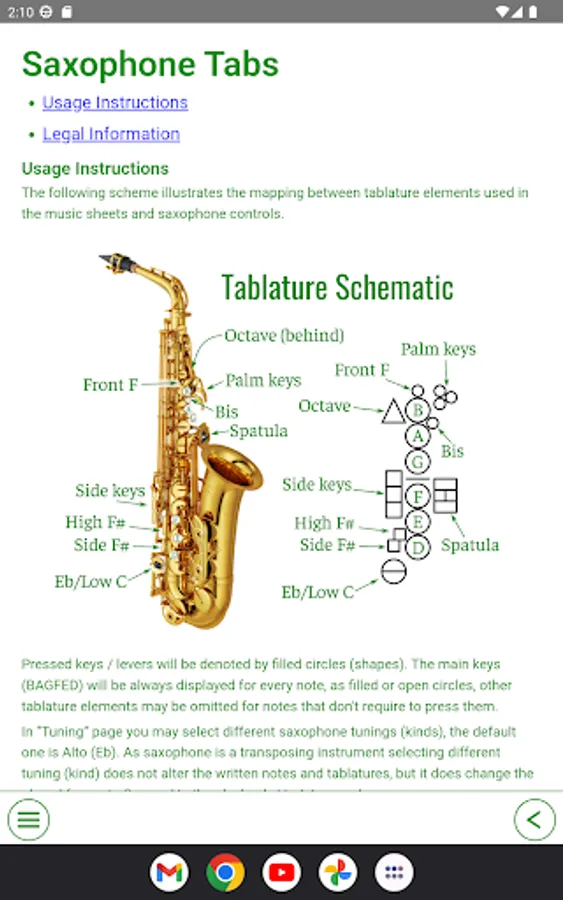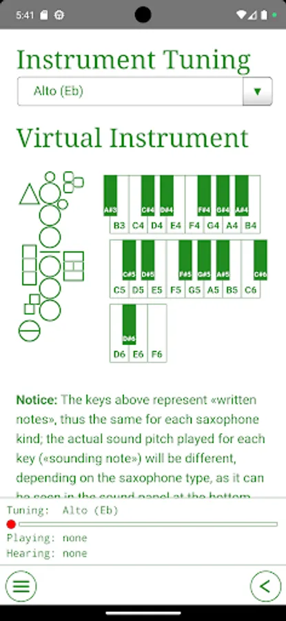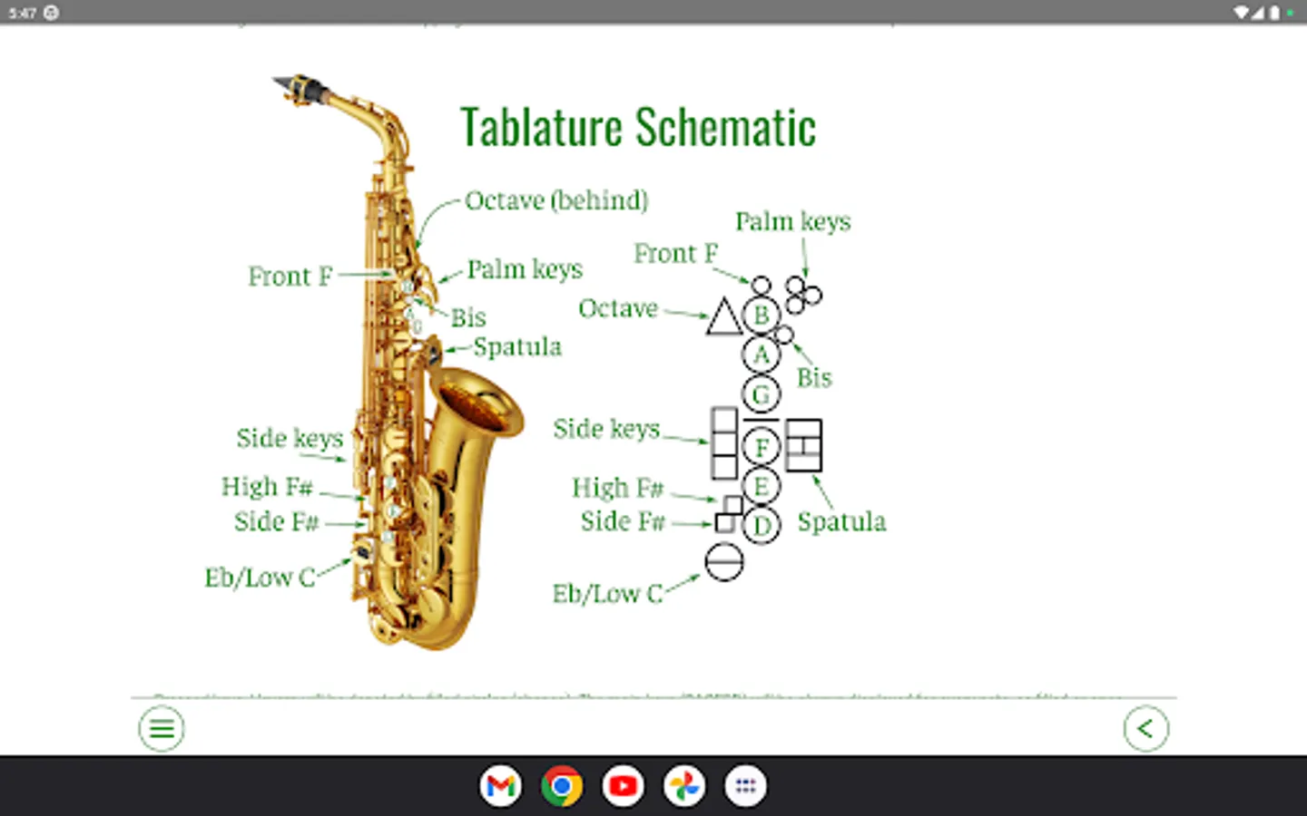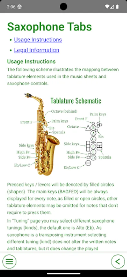 Sheet music with notes, tablatures, and interactive training for saxophones of different kinds. This app helps learning to play popular traditional melodies, and some other tunes from the public domain.