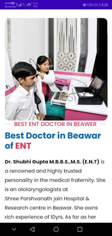 Shree Parshvanath jain Hospital & Research centre in Beawar. She owns rich experience of 10yrs. As far as her qualifications are concerned she has done her M.B.B.S from Govt. College kota & M.S from Netaji Subhash Chandra Bose Medical College Jabalpur. After this, she is expert in consultation regarding Head & Neck Cancer and she also offers expert treatment of problems like submucous fibrosis , leucoplakia , etc. She offers advanced treatments for diseases like nasal allergy, sinusitis , ear discharge, deafness,vertigo,tinnitus,lymphadenitis and all other ENT problems. Looking at her ever increasing popularity, one thing is for sure that she is one of the most trusted doctors in Beawar. She also provides facility of endoscopic check-up of Ear,Nose and Throat at her clinic. She is a smiling, well-behaved and polite doctor and she has numerous successful treatment cases registered in her name & patients are very happy with her the kind behaviour.