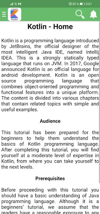 Kotlin is a programming language introduced by JetBrains, the official designer of the most intelligent Java IDE, named Intellij IDEA. This is a strongly statically typed language that runs on JVM. In 2017, Google announced Kotlin is an official language for android development. Kotlin is an open source programming language that combines object-oriented programming and functional features into a unique platform. The content is divided into various chapters that contain related topics with simple and useful examples.