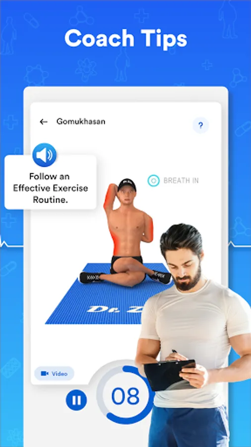 The app guides you with all different kinds of home exercises in detail. It also provides you with virtual therapist at home itself to guide you progressively along with a 3D Video for free.