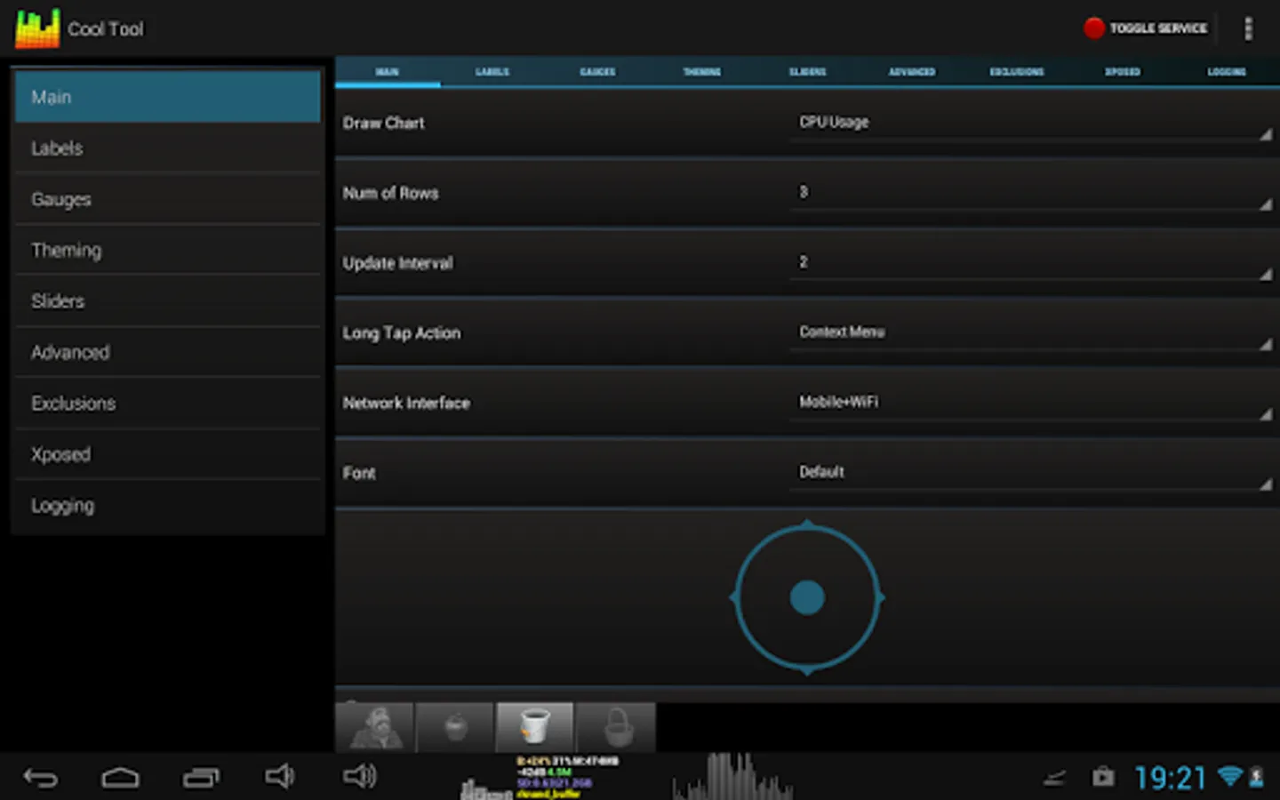 Press Show Panel button to enable dashboard. You can drag floating window over the screen or double tap to open settings. See video and screen-shots for details.