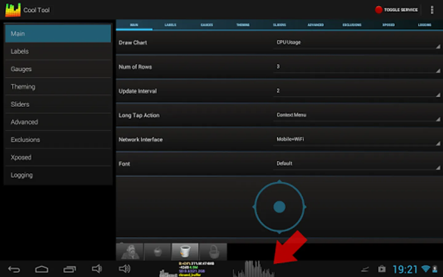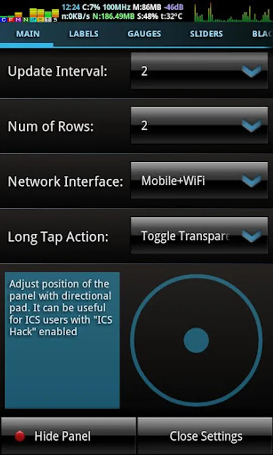 Press Show Panel button to enable dashboard. You can drag floating window over the screen or double tap to open settings. See video and screen-shots for details.